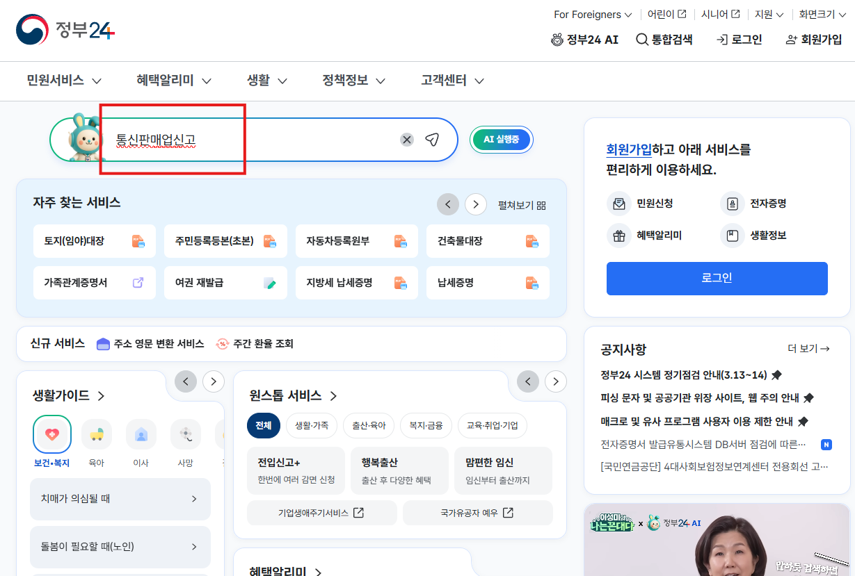 그리고 정부 24 (https://plus.gov.kr/) 로 들어가서 통신판매업신고 검색!
