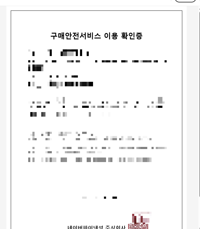 우측 상단에 초록색버튼 "구매안전서비스 이용확인증" 이 있는데